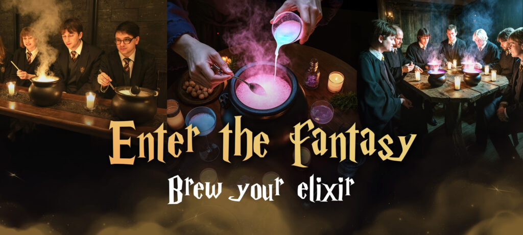 Beleef de magie van toverdrankjes in een volledig aangeklede fantasy omgeving: een echte beleving, geen standaard workshop. Onder begeleiding van onze deskundige Potions Masters leer je op speelse wijze elixers brouwen die verrassen in smaak én presentatie. Geschikt voor alle niveaus, van beginners tot ervaren cocktailmakers. Geen voorkennis nodig.
