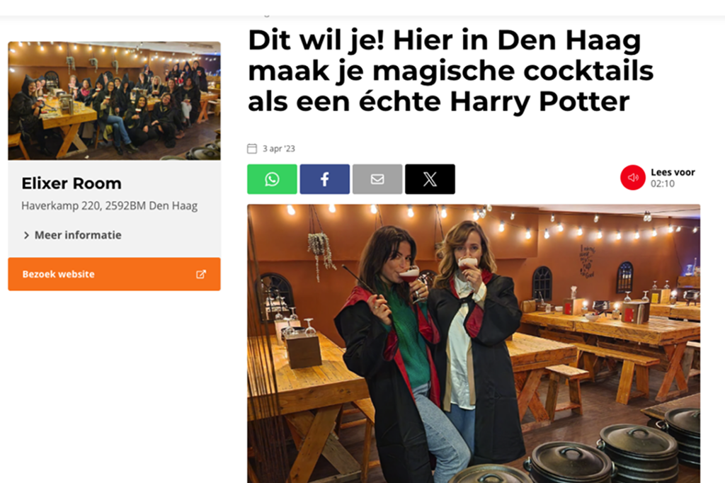 Bij Elixer Room draait het om verhalen en avonturen. Onze Potions Masters zijn als tovenaars die met elke shake en stir een magische formule creëren die je smaakpapillen betovert. En raad eens? Die langverwachte Harry Potter geïnspireerde cocktail workshop is nu eindelijk een feit! Ontdek de geheimen van het brouwen en de kunst van het cocktail maken in een omgeving doordrenkt van magie.